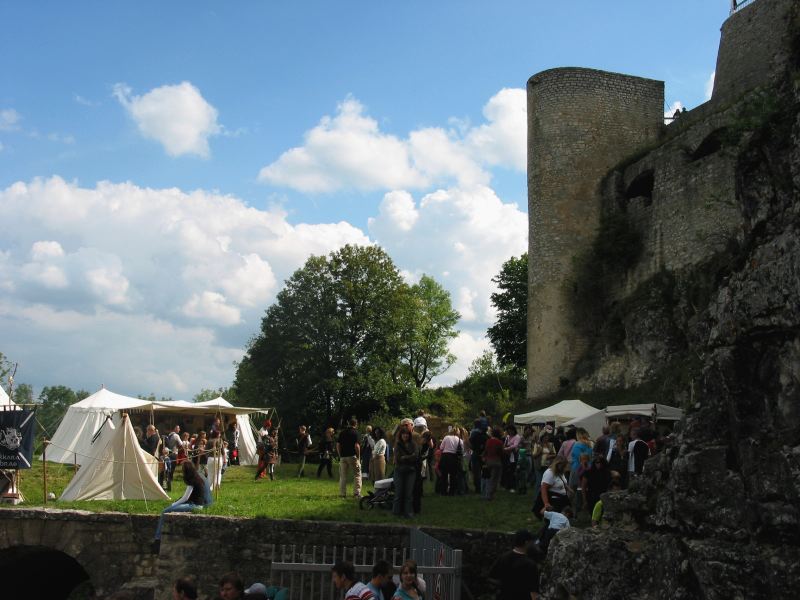 Dem blauen Dreieck folgend, ging es zunächst in Richtung Owen und ausserhalb von Beuren dann auf einem steilen Pfad hinauf zum Beurener Fels, von wo man einen schönen Ausblick auf Beuren und der Burg Hohenneuffen hat. Am Waldsaum der Baßgeige wanderten wir weiter zum Brucker Fels und nach einer kleinen Rast folgten wir dem roten Dreieck weiter nach Erkenbrechtsweiler, zum Wilhelmsfels und der Burg Hohenneuffen. Auf dem Hohenneuffen angelangt, fand zur unserer Überraschung an diesem Wochenende auch das Mittelalterliches Burg-Spectaculum statt.